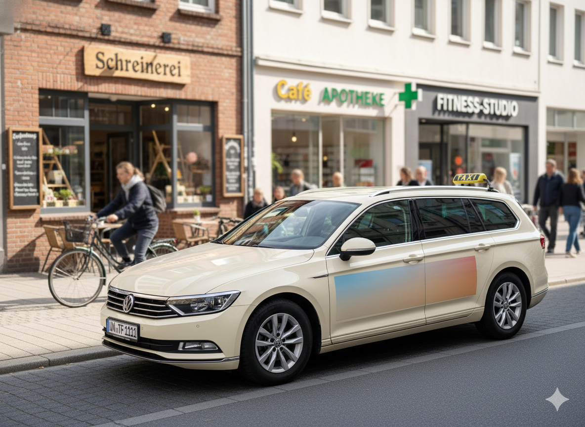 Taxiwerbung begleitet Menschen auf ihren täglichen Wegen – ganz ohne Unterbrechung und ohne digitale Ablenkung. Während klassische Onlinewerbung oft übersehen oder blockiert wird, ist Werbung auf unseren Fahrzeugen ständig präsent und fällt durch ihre unmittelbare Nähe zum Betrachter sofort ins Auge.